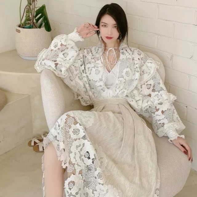 デザイン刺繍ブラウス+ロングスカート