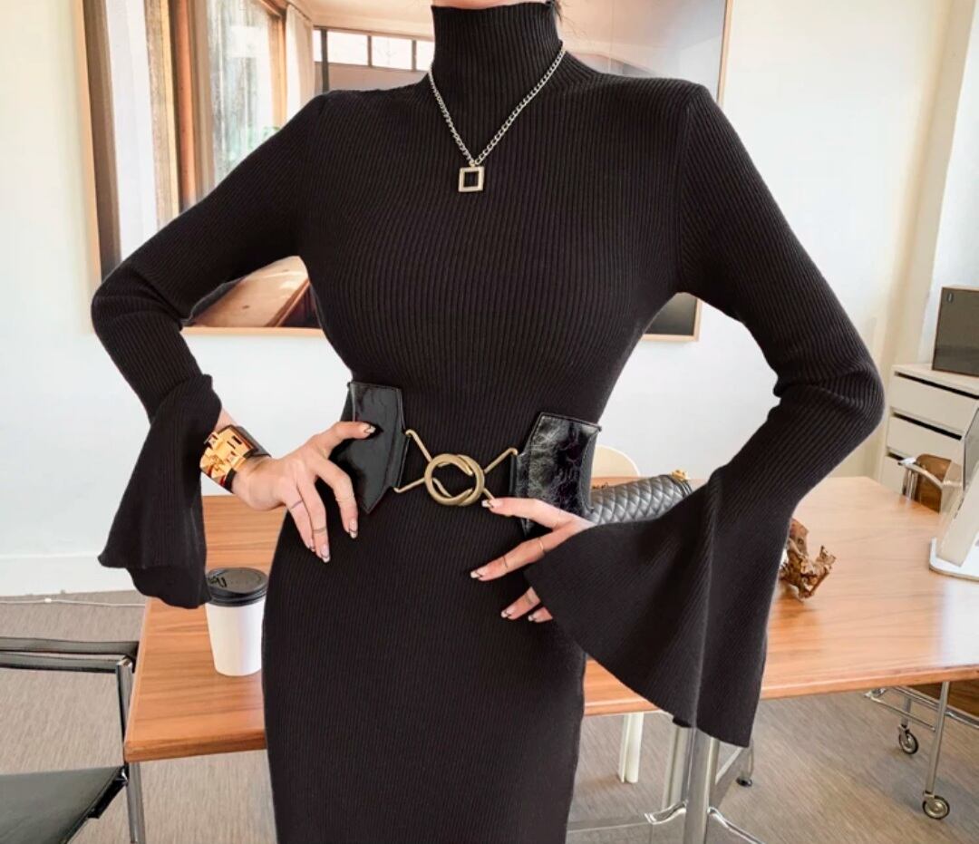 タートルネックリブニットアンバランスロングワンピース、ベルト2点セット
